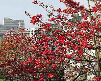 自從十九年前搬進新居,就與這些木棉科落葉大喬木為鄰。起初她們並不顯眼,沒有幾個人能準確說出何時栽植於此,由細小青澀的樹苗長成參天大樹。如今每至早春花期,她們開得繽紛絢麗,成為奪目的一種木本花卉。雖然木棉花不是我們這座城市的市花,但隨處能見她們的身影,絲毫不影響廣大市民對它的喜愛。