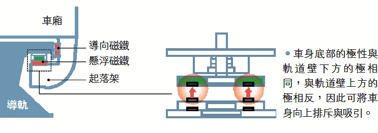 磁浮列車是利用「同性相斥、異性相吸」的電磁浮原理,以磁鐵對抗地心引力。簡單來說,導軌的「導向磁鐵」用作引導列車前進、「懸浮磁鐵」則令列車浮起。