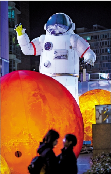 近日晚間,市民在北京市朝陽區望京地區一處商圈戶外設置的太空主題充氣展示裝置間駐足。\中新社