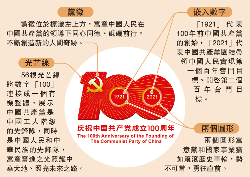 56根光芒線將數字「100」連接成一個有機整體,展示中國共產黨是中國工人階級的先鋒隊,同時是中國人民和中華民族的先鋒隊,寓意奮進之光照耀中華大地、照亮未來之路。