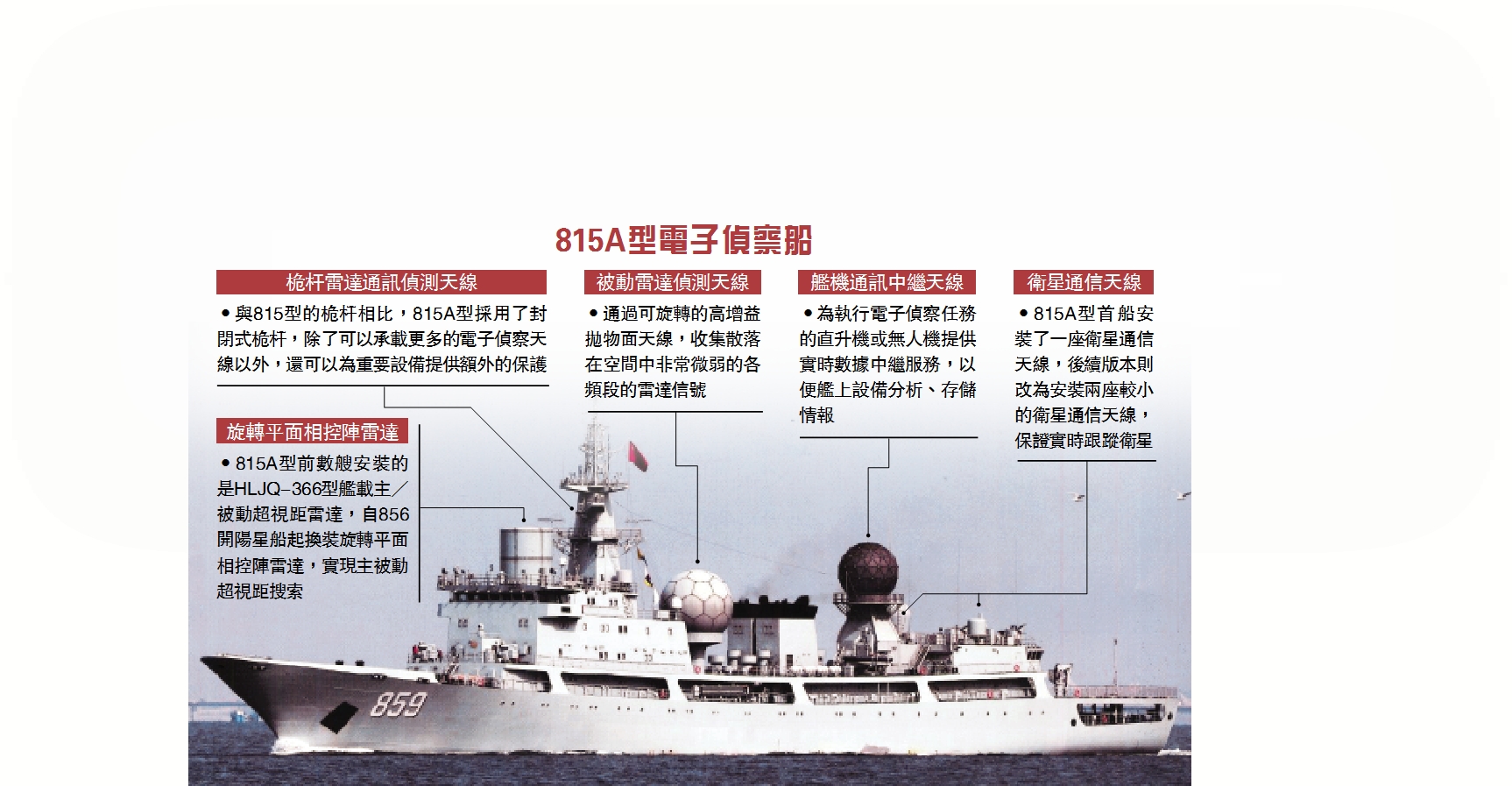 •與815型的桅杆相比,815A型採用了封閉式桅杆,除了可以承載更多的電子偵察天線以外,還可以為重要設備提供額外的保護