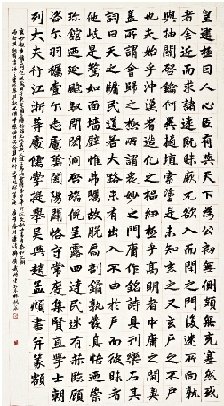 元代至元三十年(一二九三年),吳興文人陵陽先生為蘇州玄妙觀重修三門撰文。大德年間,年屆半百的趙孟頫寫下了《玄妙觀重修三門記》碑文。這件墨跡現藏日本東京國立博物館。明代學者李日華讚曰:「文敏此書有泰和(李邕)之朗而無其佻,有季海(徐浩)之重而無其鈍,不用平原(顏真卿)面目而含其精神,天下趙碑第一也。」評價之高,實至名歸。我臨的是上海辭書出版社放大本,寫了二紙,此其一也。趙孟頫此書,結體嚴整,筆法圓熟。因是墨跡,用筆方法,更易看清。最宜初學者臨摹。他認為:「學書有二,一曰筆法,二曰字形。筆法弗精,雖善猶惡;字形弗妙,雖熟猶生。學書能解此,始可以語書也。」可見用筆和結體都是非常重要的,只要全面掌握了它們的技法,在學書的道路上就能暢通無阻了。