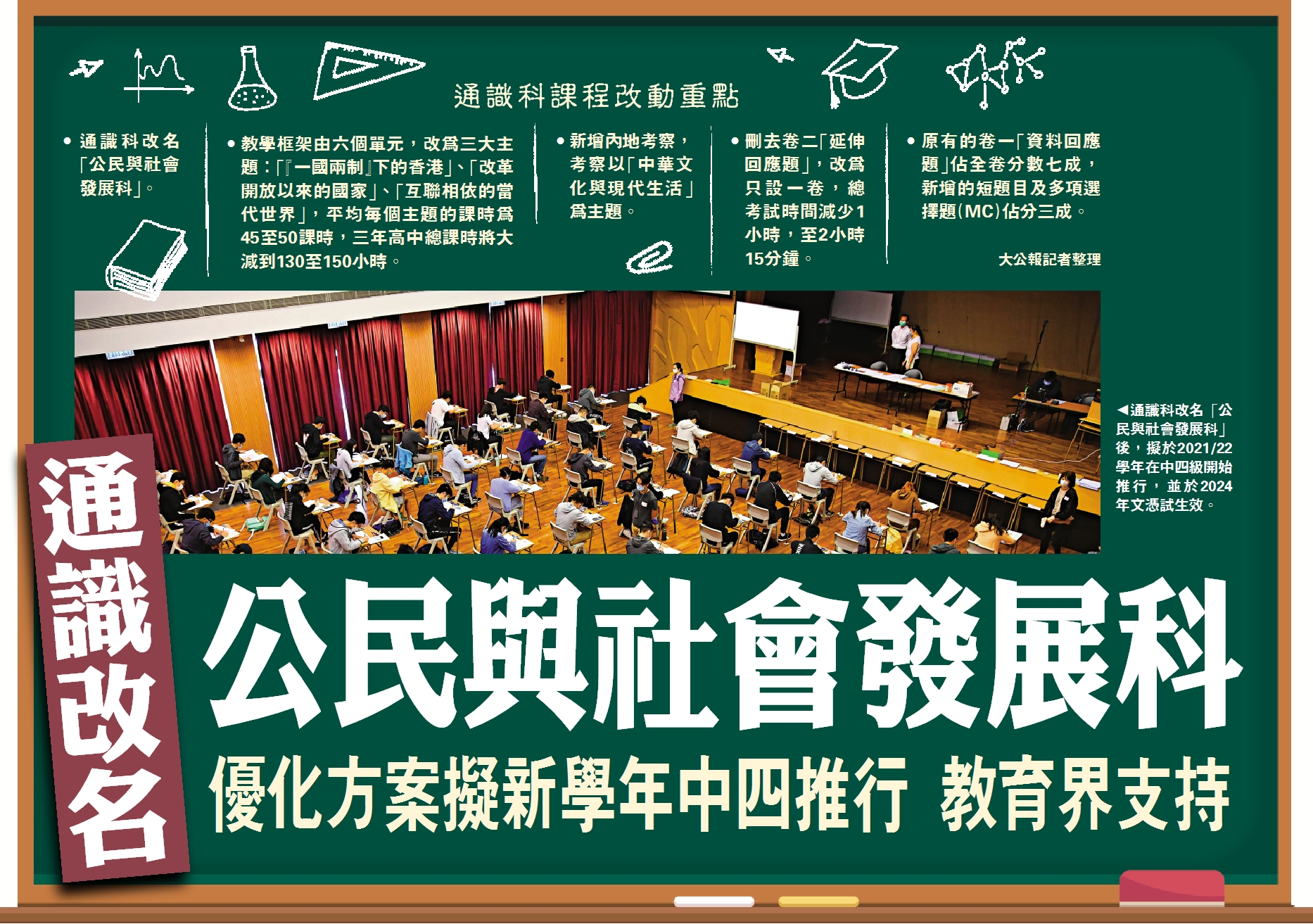 新高中通識科改名揭盅,課程發展議會宣布,學科將改名為「公民與社會發展科」。今年2月,教育局曾公布該科目的優化方案,除了列出六個備選名稱,還將原先的六個單元縮減為三大主題、維持必修必考等。議會昨日表示,期望教育局讓優化方案於2021/22學年在中四級開始推行,會議上亦通過在2021/22學年中四開始停止開設組合科學和綜合科學科的方案。