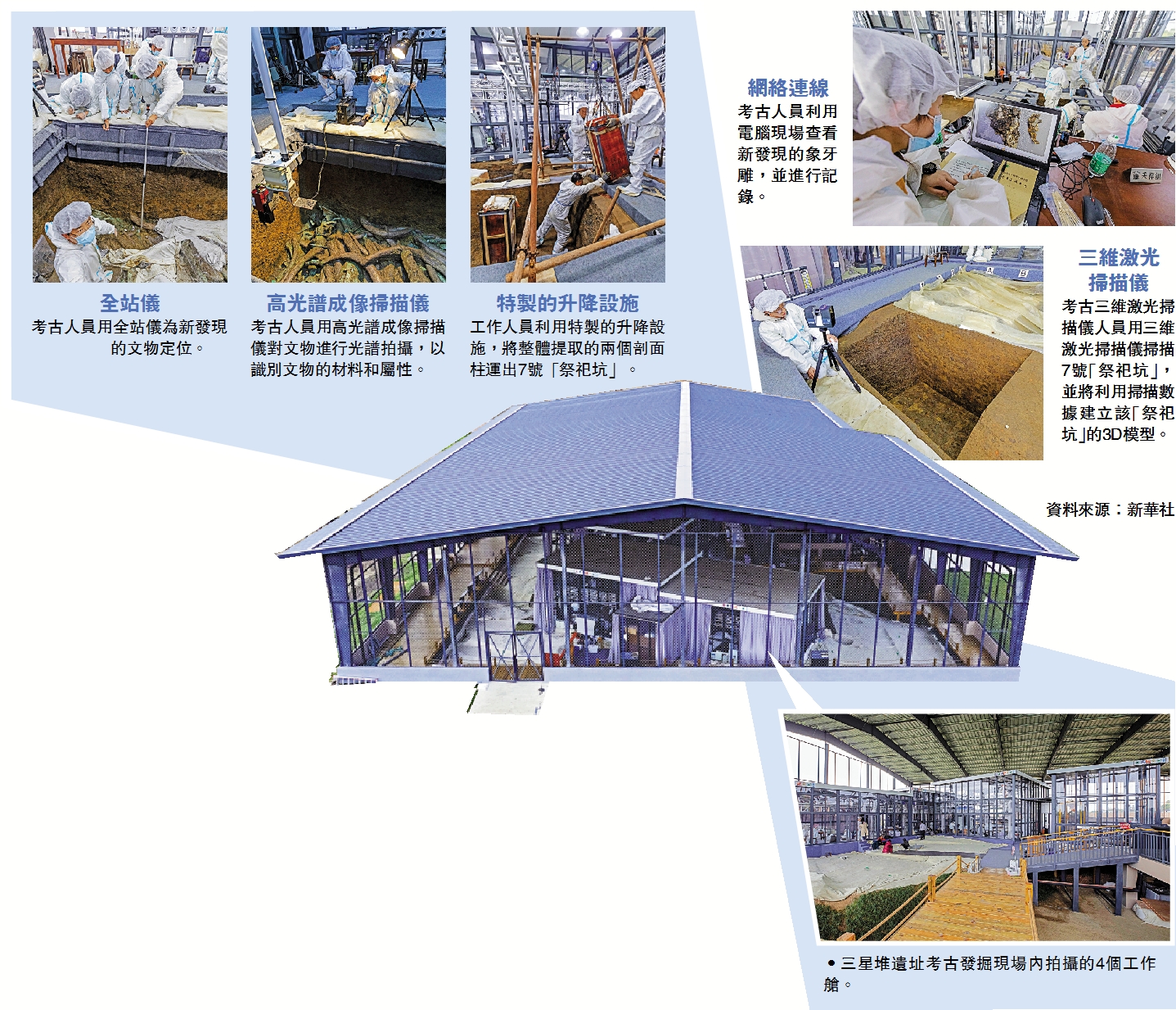三星堆考古發掘現場被大跨度鋼結構大棚覆蓋(右圖),裏面有數個通透的玻璃「考古艙」將新發現的6個「祭祀坑」罩住。這些「考古艙」不僅能控制發掘現場的溫度、濕度,還能減少工作人員帶入現代的微生物、細菌等。「考古艙」裏裝滿各類設備,工作人員穿着「防護服」開展「野外」考古。在「考古艙」旁設有各種應急文物保護實驗室和庫房,各種先進設備一應俱全。