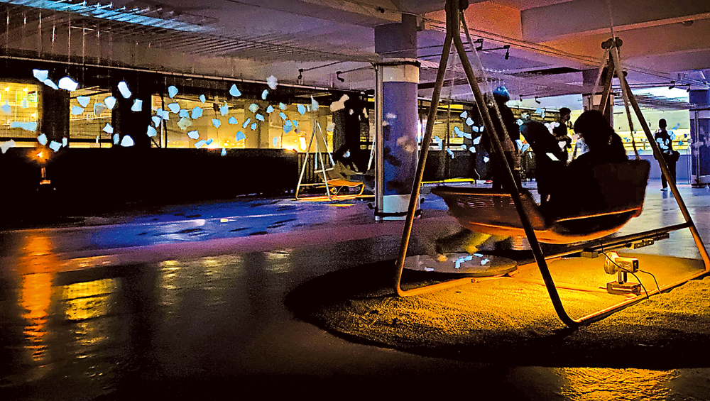 參觀者將置身於獨特的場域空間,與場內各種藝術裝置呼應,引發對「待渡」時刻的種種思考。於夕陽斜照或光影之中,觀眾走過碎裂的瓷片,坐上互動鞦韆裝置,搖晃間牽動由陶瓷碎片組裝而成的風鈴。風鈴聲、頌缽裝置、現場聲境隨機交錯,跟隨鞦韆晃盪,呈現「枯山水」(karesansui)般的寧靜美。