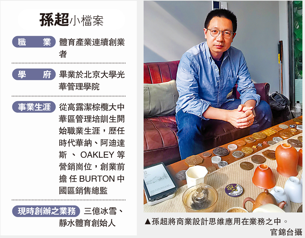 設計服裝、設計工業產品甚至設計管理流程都進入國人視野,體育也能設計嗎?早年負責多個體育品牌在華推廣工作的孫超坦言,他是在北大光華管理學院MBA課上靈光一現,繼而三年前全身心投入「設計體育的工作」。身為靜水體育的創始人,他以「商業體育設計思維」為組織的核心能力,在短短3年時間內,孵化數個高潛力體育生態IP,趟出了一條體育加旅遊、體育加軍事和體育加冰雪的商業大道。\官錦台(文) 受訪者(圖)