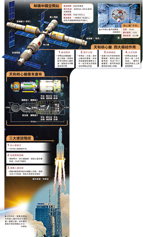 【大公報訊】4月29日11時23分,中國空間站天和核心艙搭乘長征五號B遙二運載火箭發射升空,準確進入預定軌道,任務取得成功。中共中央總書記、國家主席、中央軍委主席習近平致賀電。中國空間站建成後,將發揮類似「太空母港」的作用,中國還會發射其他飛行器和空間站長期共軌飛行,短期停靠在空間站上進行維修維護,實現推進劑補加和加油。有航天專家表示,這種「補給站」模式是非常創新的,比國際空間站走得更前。