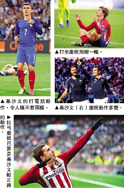 基沙文的慶祝動作花款很多,但以他在馬體會時代的「打電話」動作最「無厘頭」。原來,他說這是加拿大饒舌歌手德瑞克歌曲《Hotline Bling》的舞步,「打電話」動作只是模仿舞步!可能實在太曲高和寡,他於俄羅斯世界盃為法國踢球時換了新動作「Take the L」,這個右手比出「L」形,左手像在騎馬的舞步。原來這動作是大熱線上遊戲《要塞英雄》中的一個跳舞姿勢,當中的L就是Loss的意思,表達勝方希望敗方接受落敗的事實,但他強調動作純粹貪玩並非挑釁對手。