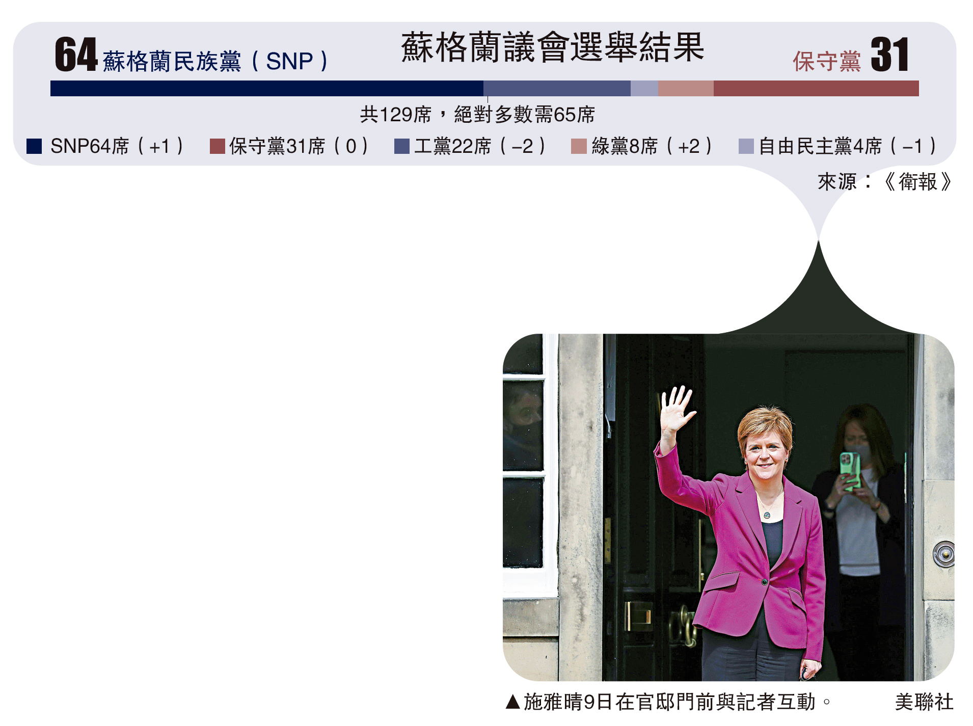 蘇格蘭議會129席中,SNP贏得64席,同樣支持獨立的綠黨贏得8席,加起來已超過半數。施雅晴8日發表勝選演說時聲稱,約翰遜無法再找到符合民主價值觀的藉口,來拒絕第二次獨立公投。她重申,首要任務是帶領民眾走出新冠疫情,但過後仍將尋求公投。