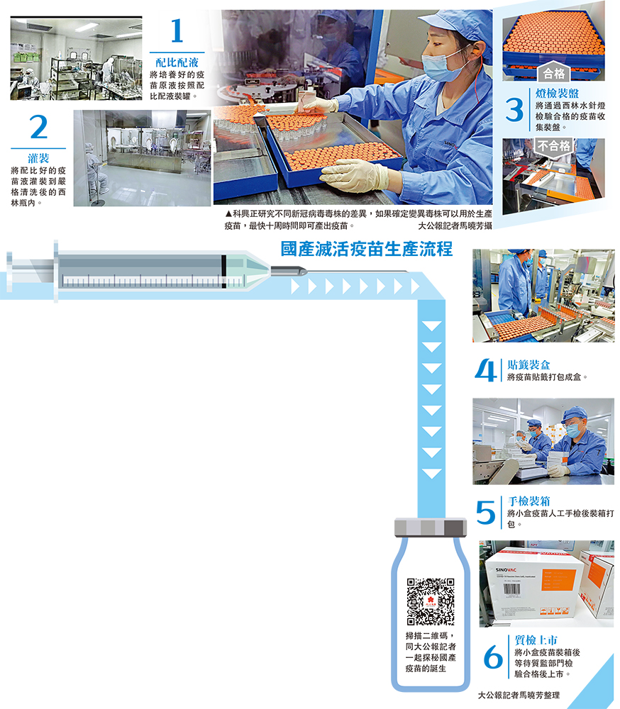 科興疫苗目前已在全球40多個國家和地區獲批使用。大公報記者11日在嚴格遵守車間無塵無菌要求下,實地探訪科興位於北京大興的疫苗生產車間。記者了解到疫苗從完成病毒培養、配比配液、灌裝、包裝到抽檢後投放市場大概需十周時間。科興控股生物技術有限公司新聞發言人劉沛誠向記者表示,針對新冠病毒的變異,科興已獲得巴西株、南非株等毒株。科興正在研究不同新冠病毒毒株的差異,如果確定變異毒株可以用於生產疫苗,最快十周時間即可產出疫苗。\大公報記者 馬曉芳北京報道