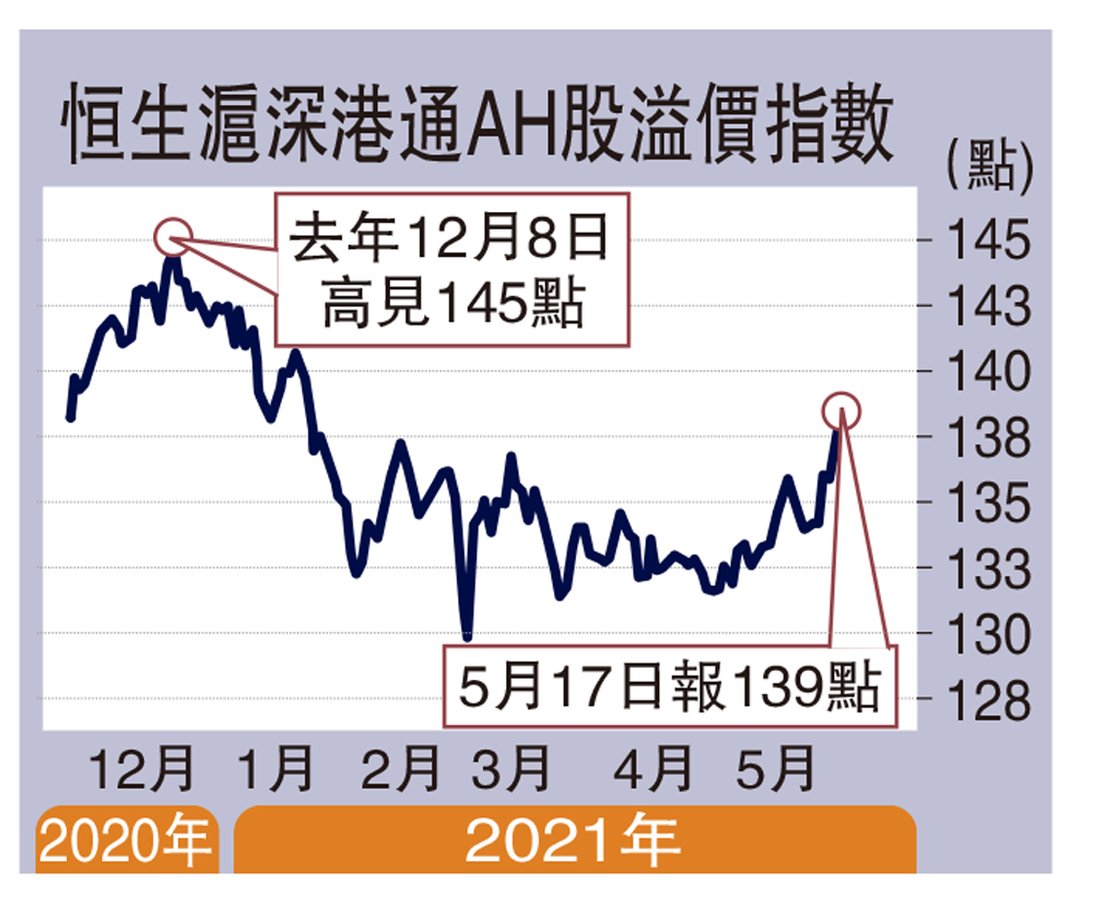 分析AH股溢價變化,投資者都習慣觀察恒生滬深港通AH股溢價指數。一般來說,當指數大於100,這代表A股相對H股存在溢價,指數愈高,A股相對H股的溢價亦愈大。指數現時約136.78點,但若然像去年升至近150點大關,這代表了A股與H股的溢價達到50%,H股這時便有機會出現追差價。