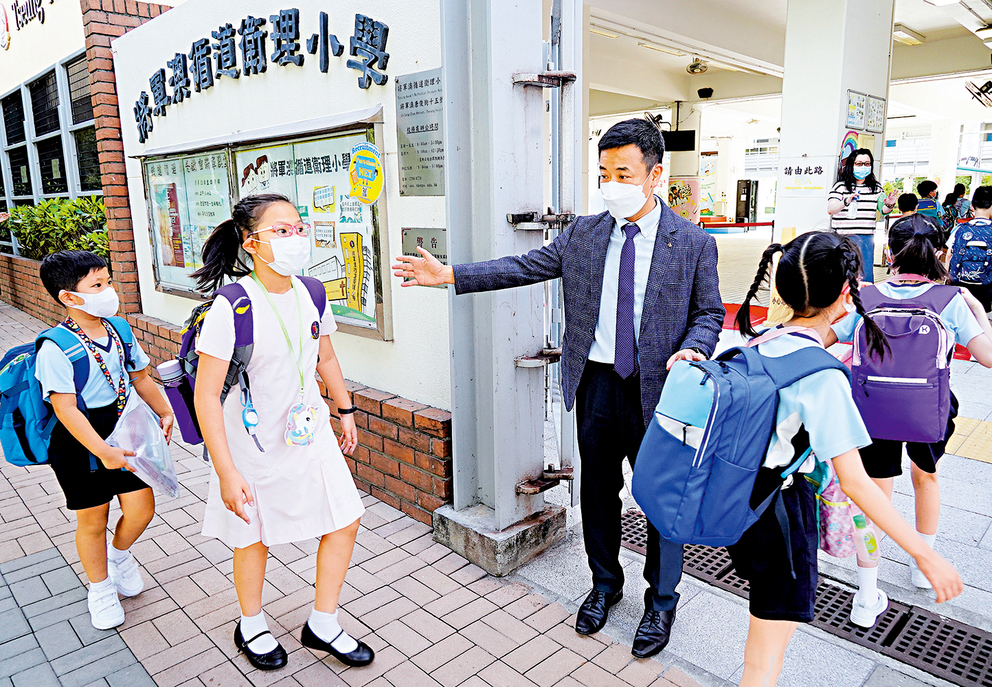 全港幼稚園及中小學由昨日起恢復半天面授課堂,可安排全校學生同時回校。大公報記者昨日到訪將軍澳循道衛理小學,校長林德育表示,可以讓全校同學同時回校,學校已經做好防疫措施來應對全面復課。校長說,「這次復課能讓學生和老師有更多的交流。學校的存在(實體教學)有另一個目的是人際之間的交流。如果疫情一直保持在平穩的狀態,復課對學生來說是好的。」另外,聖公會聖雅各小學校長張勇邦表示,會鼓勵教師接種疫苗,自己已打完兩針,冀起到示範作用。小學生對復課感開心:「希望老師打疫苗,而且我自己也想打」。\大公報實習記者 鍾怡(文) 梁堅(圖)