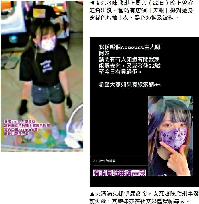 上周六(22日)晚上,兩人相約在旺角新之城地庫一間遊戲機中心玩樂,當時有店舖「天眼」攝下陳女活動情況和其衣着,之後陳女杳無音信,其家人苦尋無果,遂報警求助,其胞妹昨日(25日)亦在社交媒體帖文尋人,指胞妹欣琪失蹤當日疑曾登上路線N241或N41X巴士前往東涌,最後露面時身穿紫色短袖上衣、黑色短褲及波鞋。惜發出尋人啟事不久後,便揭發欣琪在滿東邨滿順樓單位內喪命,家人悲慟不已。