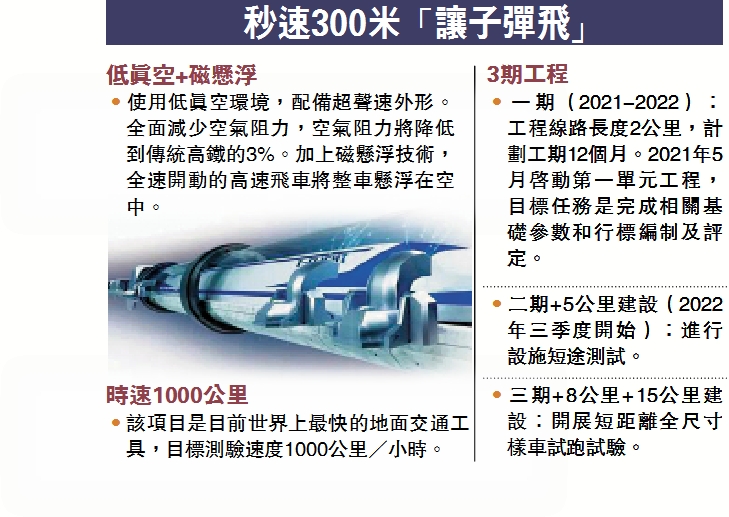 中北大學電氣與控制工程學院院長馬鐵華介紹,高速飛車透過超導磁懸浮技術與地面脫離接觸來消除摩擦阻力,利用內部接近真空的管道線路來大幅減少空氣阻力,從而實現1000公里/小時以上的「近地飛行」,具有更快速、更便捷、更舒適、更安全和經濟可控的特點。馬鐵華說:「高速飛車可以達到300米/秒的速度,相當於是傳統子彈的速度,真正是『讓子彈飛』。」
