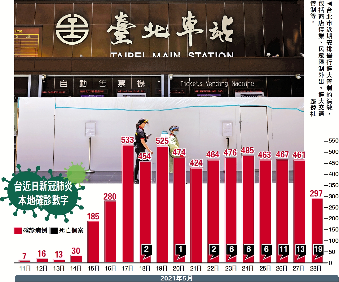 【大公報訊】綜合中通社及中央社報道:台當局疫情指揮中心表示,28日新增的297例本土病例,發病日介於4月29日至5月27日;個案分布以新北市136例最多,其次為台北市94例;校正回歸個案258例中,發病日介於5月11日至5月27日;個案分布以新北市141例最多,其次為台北市114例。