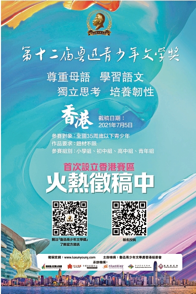 【大公報訊】第十二屆魯迅青少年文學獎香港賽區徵文昨日(28日)正式啟動。今年是魯迅青少年文學獎首次設立香港賽區,旨在發現並培養優秀的香港青少年文學創作者。即日起全港中小學生及35歲以下青年均可免費參加,徵文截止日期為7月5日。