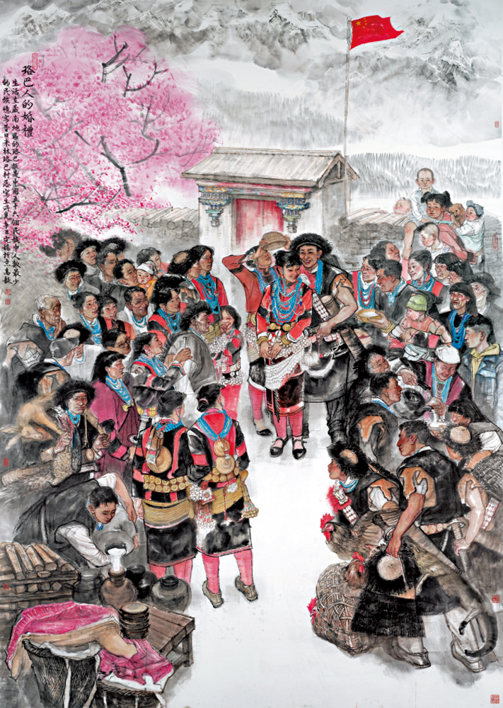 西藏珞巴族世代居住在高山峽谷地帶,長期過着與世隔絕的原始部落生活。新中國成立以來,西藏民生條件不斷改善,珞巴人也逐漸享受到祥和富足的小康日子。中國畫《珞巴人的婚禮》就描繪了珞巴族喜慶熱烈的婚禮場面,展示了珞巴族特有的傳統民俗。