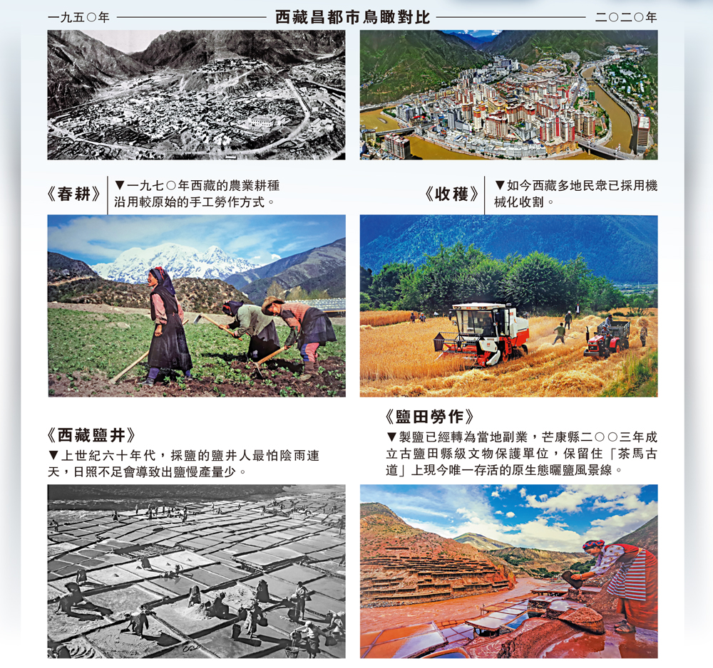 兩張分別攝於一九五○年和二○二○年的西藏昌都市鳥瞰照片,是西藏各地方發展進步的一個縮影。昌都先於拉薩半年得到解放,七十年來,其地區生產總值和農牧民收入都增長了五百多倍。照片上昌都村民阿旺江村說:「作為農奴的後代,我很慶幸自己生在新社會。我們村家家戶戶都住上了新房,汽車、摩托車、電視機、冰箱、電話、電腦等出行工具和生活電器應有盡有,幸福生活比蜜都還甜。」