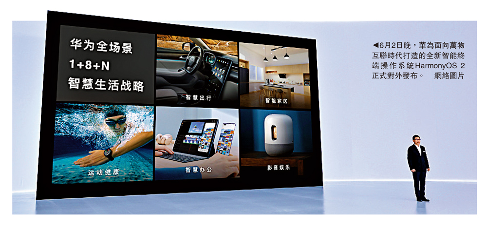 華為6月2日晚舉行線上發布會,面向萬物互聯時代打造的全新智能終端操作系統HarmonyOS 2正式對外發布,這也意味着「搭載HarmonyOS(鴻蒙)的手機」已經變成面向市場的正式產品,會上公布HarmonyOS「百」機煥新計劃,將陸續向華為手機、平板、智慧屏等智能終端設備推送升級HarmonyOS 2,到明年上半年計劃實現「百」款設備升級HarmonyOS 2。HarmonyOS讓用戶將手機與其他設備「碰一碰」,即可自由組合硬件,手機、手錶、板腦、電視等硬件設備,融合成一個系統。據介紹,華為正在與全球排名前200的App廠商溝通合作,共同開發跨終端設備的應用,同時已有超過1000家硬件企業加盟,一起構建全場景的HarmonyOS生態設備。\大公報記者 毛麗娟深圳報道