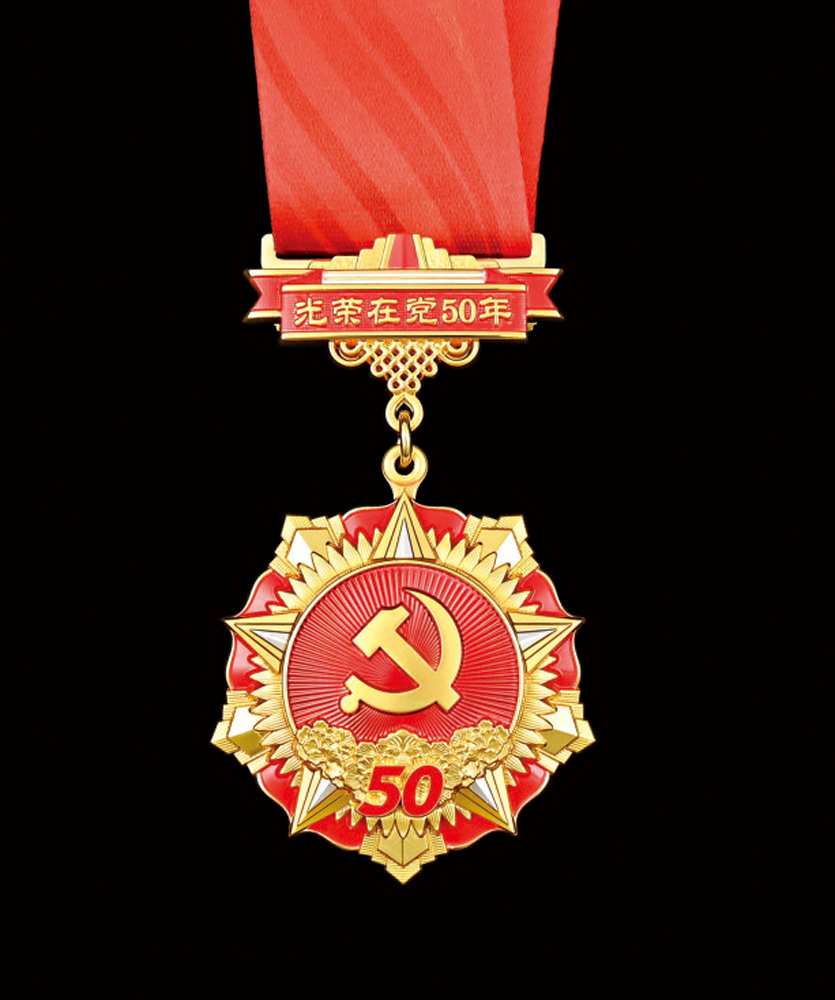「光榮在黨50年」紀念章通徑為50毫米,材質為銅和鋅合金,主色調為紅色和金色。主章由黨徽、五角星、旗幟、豐碑、向日葵、光榮花、光芒等元素構成,其中黨徽象徵黨的領導核心地位和黨員信念堅定、對黨忠誠;豐碑寓意黨的光輝歷程和豐功偉績;向日葵寓意全黨全國各族人民緊密團結在黨中央周圍;光芒象徵黨的光輝照耀;五角星代表薪火相傳;光榮花寓意繁榮盛世、國泰民安和褒獎榮耀;旗幟象徵共產主義崇高理想與事業永續。副章由山河、中國結和紅飄帶等元素組成,飄帶上雕有「光榮在黨50年」字樣,寓意黨員不忘初心、牢記使命,勇攀高峰、永葆青春。