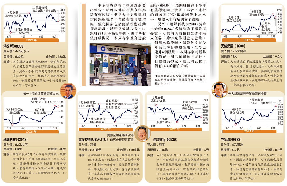 中金等券商在年初連珠炮發出報告,唱好內地銀行業今年業績有望恢復,個別大行更樂觀相信內銀板塊全年業績有雙位數增幅,催化因素包括經濟復甦拉動貸款需求、壞賬撥備減少等。內銀股在5月份橫行整固,後市料有望打破悶局;本周專家推介建設銀行(00939),預期股價在下半年有望穩定向上發展。再者,建行的市盈率(PE)低於同業平均水平,現價入市有足夠安全邊際。