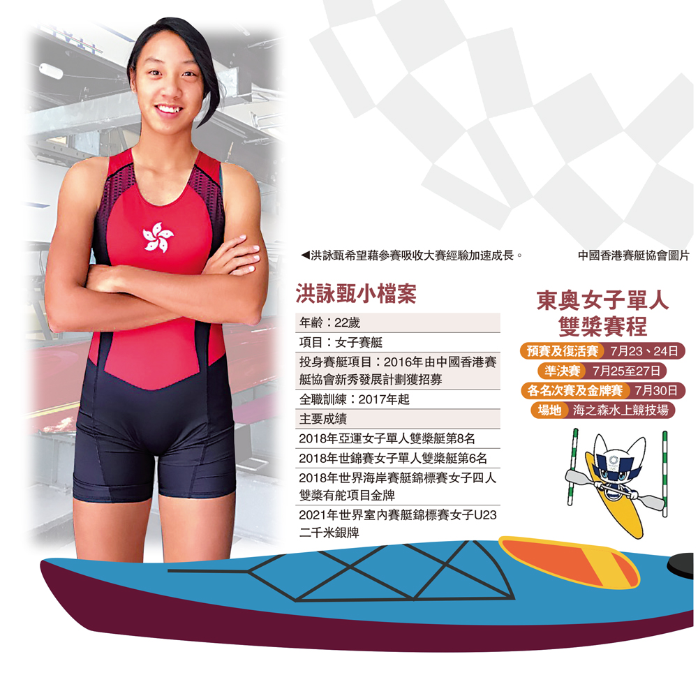 香港賽艇隊今次東京奧運將派出一名選手參加,年僅22歲的洪詠甄將首次參加奧運會,出戰女子單人雙槳艇項目。昨午洪詠甄在體院會見傳媒,簡介備戰情況。她表示對自己第一次參加奧運感到很興奮和緊張,很榮幸能夠代表香港去參加奧運,覺得沒有白費這幾年練習的成果,希望爭取更高的名次。