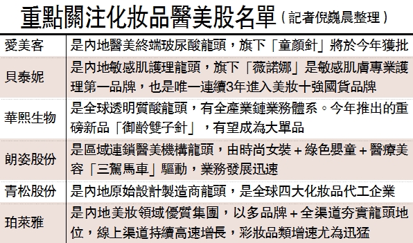 投資策略方面,王立平建議,首先,關注「研發拿證」壁壘高,且具有較強盈利能力的上游公司;其次,關注目前尚處於「跑馬圈地」階段,且旗下擁有手術與非手術類相結合的綜合類連鎖醫美機構;最後,關注化妝品產業鏈賽道,其重點是行業增速快、集中度高的功能性護膚品公司,以及國產化妝品龍頭企業,一些低估值的化妝品製造龍頭公司同樣值得關注。