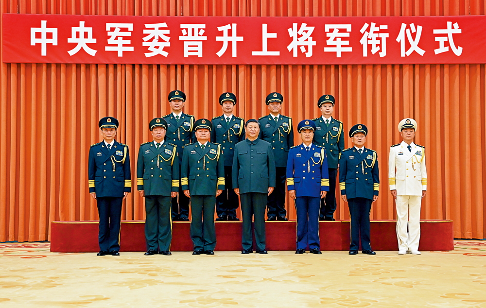 【大公報訊】據新華社報道:中央軍委晉升上將軍銜儀式5日在北京八一大樓隆重舉行。中央軍委主席習近平向晉升上將軍銜的軍官頒發命令狀。這次晉升上將軍銜的軍官是:南部戰區司令員王秀斌、西部戰區司令員徐起零、陸軍司令員劉振立、戰略支援部隊司令員巨乾生。