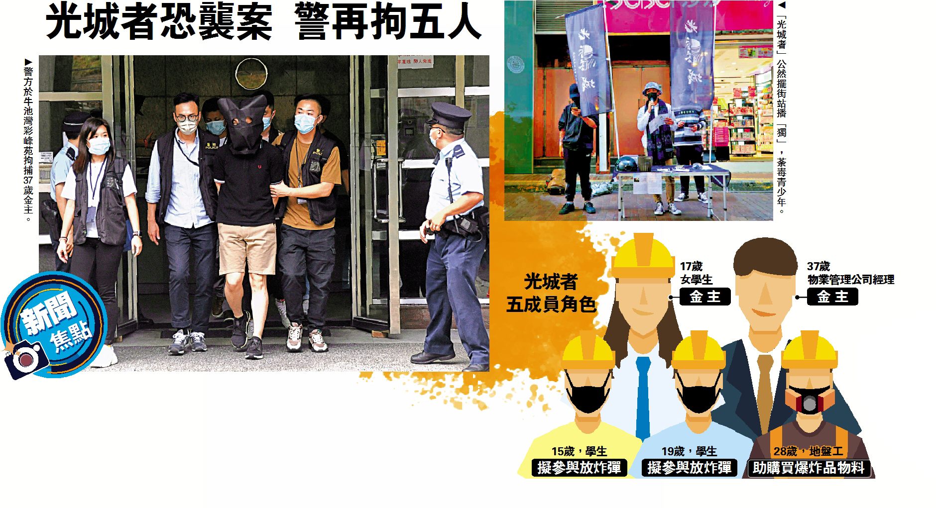 激進「港獨」學生組織「光城者」密謀策動炸彈恐襲,事件再有驚人進展。繼早前九名大學中學職員及學生,包括疑為「金主」的浸大公關及傳訊主任杜倚獅和其妻等被捕後,警方國安處昨日再拘五人,包括兩名新「金主」,分別為一名女中學生及一名任職物業管理公司男經理,出資予另外兩名中學生放炸彈。消息指,女生的資金竟是父母給予的零用錢。該恐襲案被捕者至今已增至14人。