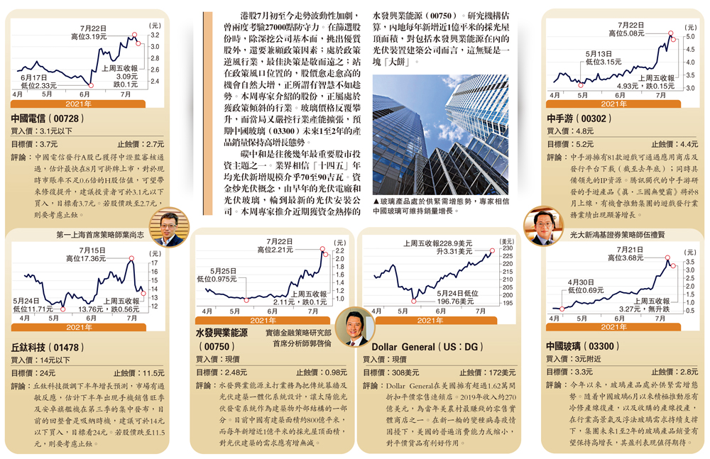 港股7月初至今走勢波動性加劇,曾兩度考驗27000點防守力。在篩選股份時,除深挖公司基本面,挑出優質股外,還要兼顧政策因素;處於政策逆風行業,最佳決策是敬而遠之;站在政策風口位置的,股價愈走愈高的機會自然大增,正所謂有智慧不如趁勢。本周專家介紹的股份,正屬處於獲政策傾斜的行業。玻璃價格反覆攀升,而當局又嚴控行業產能擴張,預期中國玻璃(03300)未來1至2年的產品銷量保持高增長態勢。