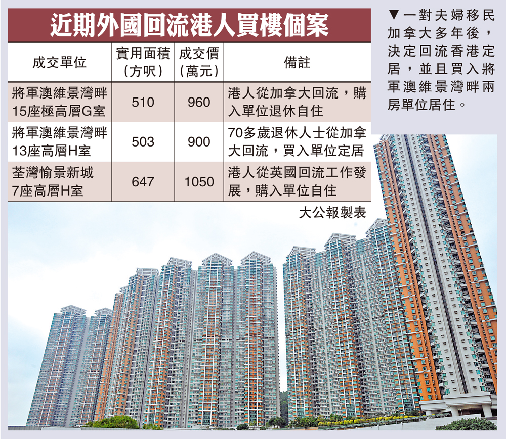 繼早前有港人看好本港就業前景較佳,從英國回流買入荃灣愉景新城單位安居後,部分漂洋過海多年的港人,如今陸續回港尋根。一對移民加拿大多年的夫婦亦回港,新近以960萬元買入將軍澳維景灣畔兩房戶,作為二人退休的安樂窩。\大公報記者 林惠芳