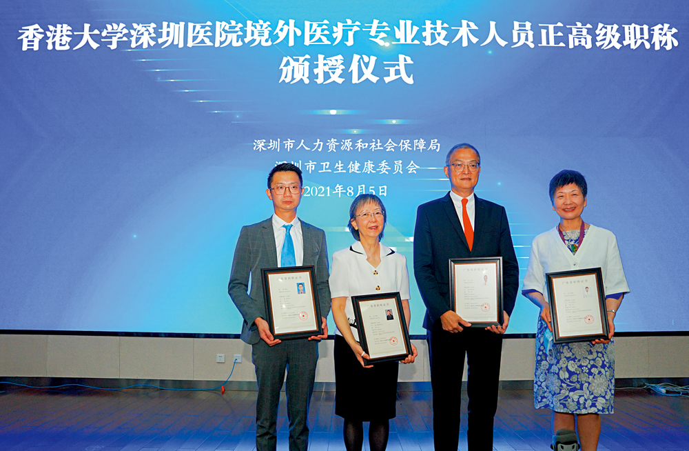 港大深圳醫院助理院長樊敬文說:「獲得正高級職稱證書後,醫生在醫療科研、服務、管理方面會更方便。以前香港醫生在內地申請課題也比較困難,不能申請的原因主要就是沒有相對應的職稱認定,但現在有了正高級職稱,不僅解決了這個問題,同時也能夠讓醫生們在手術授權、醫生培訓等方面更加規範化。」香港特別行政區政府駐深圳聯絡處主任鄧秀嫻表示,希望內地和香港的醫療管理體系有更多的交流,有更多的香港醫療專業人才到內地服務,「這對於在大灣區生活和工作的港人來說尤為重要,更能提升兩地的醫療水平。」