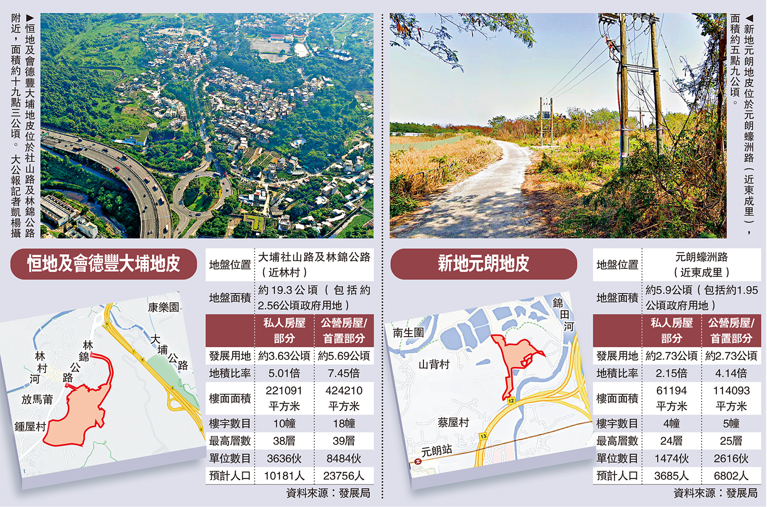 發展局再接獲兩宗「土地共享先導計劃」申請,兩幅用地分別位於元朗及大埔,由新鴻基地產旗下公司,以及恒基兆業地產及會德豐地產旗下公司提出,兩項目規模均大過首幅用地申請,料兩地可提供逾1.6萬個單位,其中約1.1萬個是公營房屋或首置上車盤,預期最快2027年完成地盤平整。