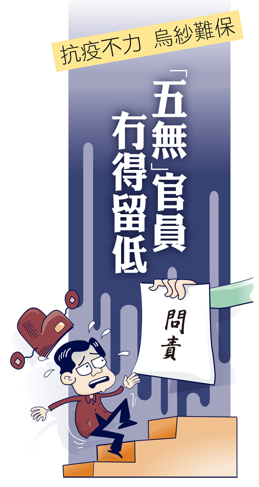 新冠病毒疫情不僅是對國民健康的一次挑戰,亦是對官員履職態度及能力的一次考驗。內地媒體統計顯示,疫情發生以來,全國各地共查處違反疫情防控紀律官員至少超千人,僅武漢一地就對630餘名履職不力官員進行問責。至近日,南京祿口國際機場疫防不力外溢多省,形成多個傳播「次中心」,7月20日以來南京、鄭州、張家界、煙台等地至少39名公職人員被免職、停職、警告、立案審查。大公報記者梳理案例時發現,被問責官員幾乎出於以下情形:對防疫重要性「無自覺」,面對相關要求表現得「無紀律」,只顧自己而「無大局」,面對上級指令卻「無跟進」,在疫情面前「無作為」。對上述「五無」官員嚴肅問責,甚至削去烏紗,一方面保障中國整體防疫工作的有力推進,另一方面展現中國政治生態中直面問題、刀刃向內的勇氣。\大公報記者 張寶峰