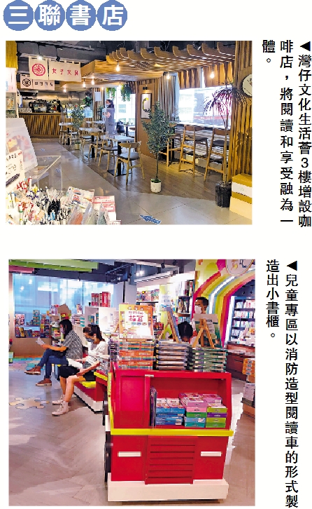 除了閱讀外,在書店內還能找到不少藝術氣息,店內擁有不少本地插畫師的作品,而當中最令人目不轉睛的就是位於三樓的巨型灣仔地圖插畫,標示出灣仔的地標及新文區。對於玩味及心思設計的兒童專區,其以消防造型閱讀車的形式製造出小書櫃和有少許位置供大人小朋友閱讀,可愛之餘又能吸引小朋友的閱讀興趣。在此處,記者最愛的就是夾雜在書櫃與書櫃之間的閱讀小角落,單人座位和桌面,旁邊的玻璃可以看到人來人往的灣仔鬧市,就像可以在繁忙之中找尋一片寧靜,不過這樣的座位並不多,想要坐在這裏安靜看書,也需要「一點運氣」。