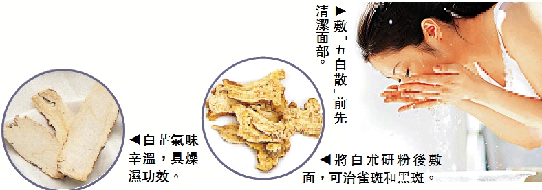在中國古方的養顏面膜中,「五白散」佔有重要地位。製作時,將五種白色的藥材打成粉末,各藥材以均等比例混合,用蜂蜜調和,做成面膜。大家使用時,敷面15分鐘後,洗淨,敷之前,皮膚要先清潔和補水。五種藥材包括──