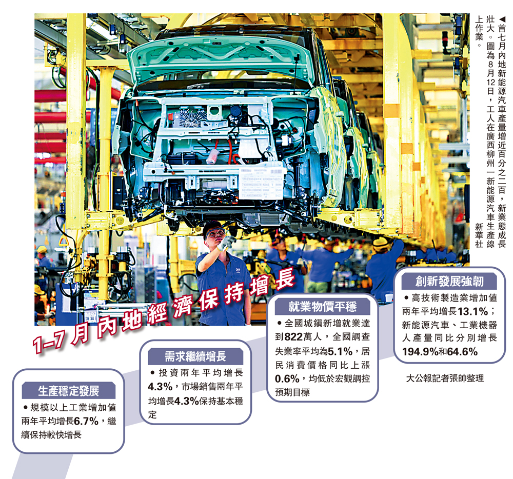 國家統計局8月16日發布的統計數據顯示,7月份,受外部不確定因素增加和內地雨災、疫情影響,內地有效實施宏觀調控,7月份國民經濟延續穩定恢復態勢。「三駕馬車」運行穩健,持續發力有基礎,當中,進出口較快增長,1-7月份貨物進出口總額同比增長24.5%。國家統計局新聞發言人付凌暉指出,綜合來看,下半年,面對持續演變的全球疫情,中國經濟仍會保持穩定恢復態勢,主要宏觀指標會保持在合理區間,發展質量繼續提升。