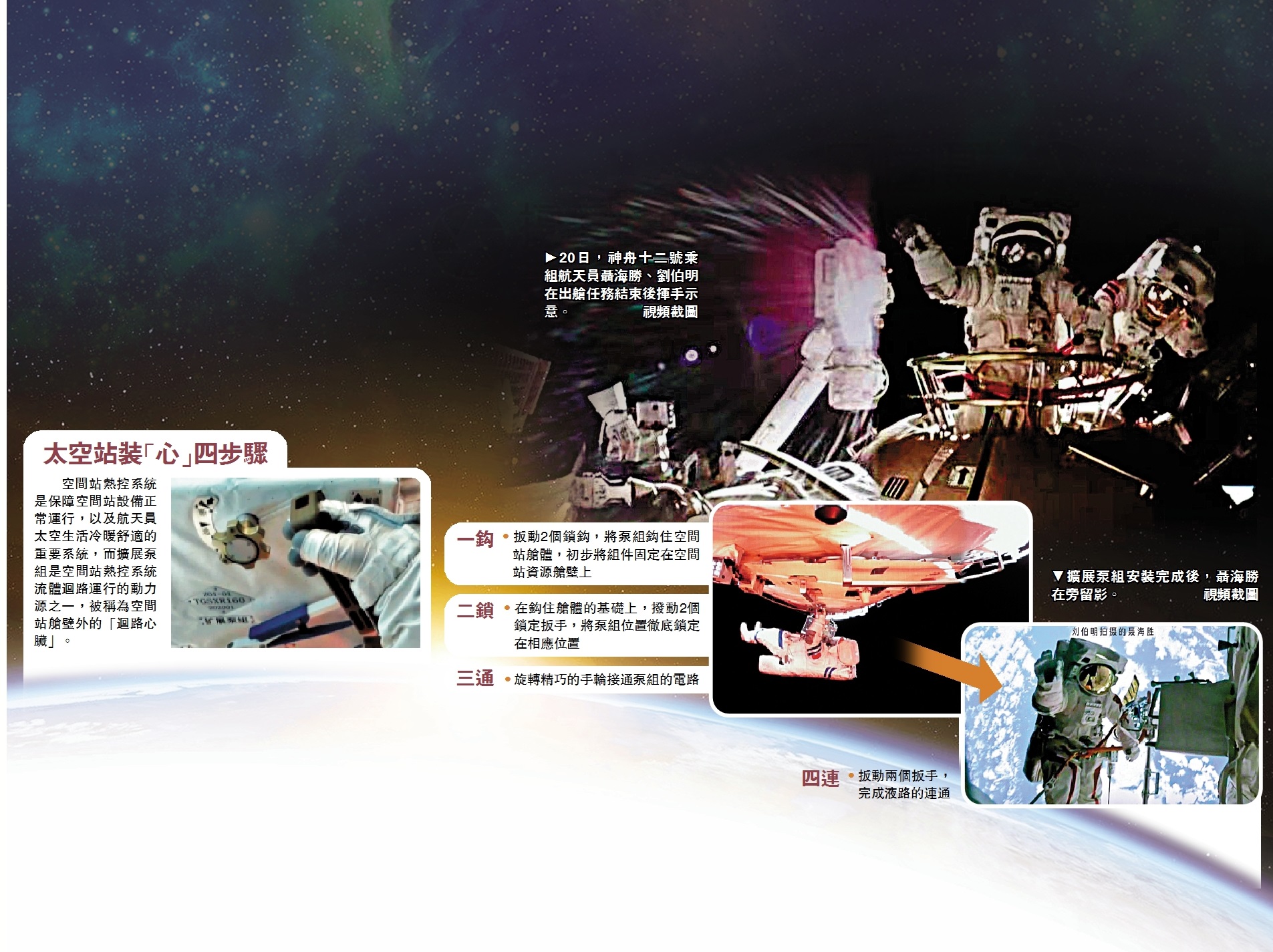 中國載人航天工程宣布,北京時間2021年8月20日14時33分,經過約6小時的出艙活動,神舟十二號航天員乘組密切協同,圓滿完成第二次太空出艙活動期間全部既定任務,航天員聶海勝、航天員劉伯明已安全返回天和核心艙。值得一提的是,在三名航天員艙內外密切配合下,本次出艙活動比原計劃提前了約1小時。據了解,熱控系統可為空間站進行散熱或補熱,而本次出艙期間安裝的艙外擴展泵組就是熱控系統流體迴路運行的動力源之一,被稱為空間站艙壁外的「迴路心臟」。\大公報記者 劉凝哲北京報道