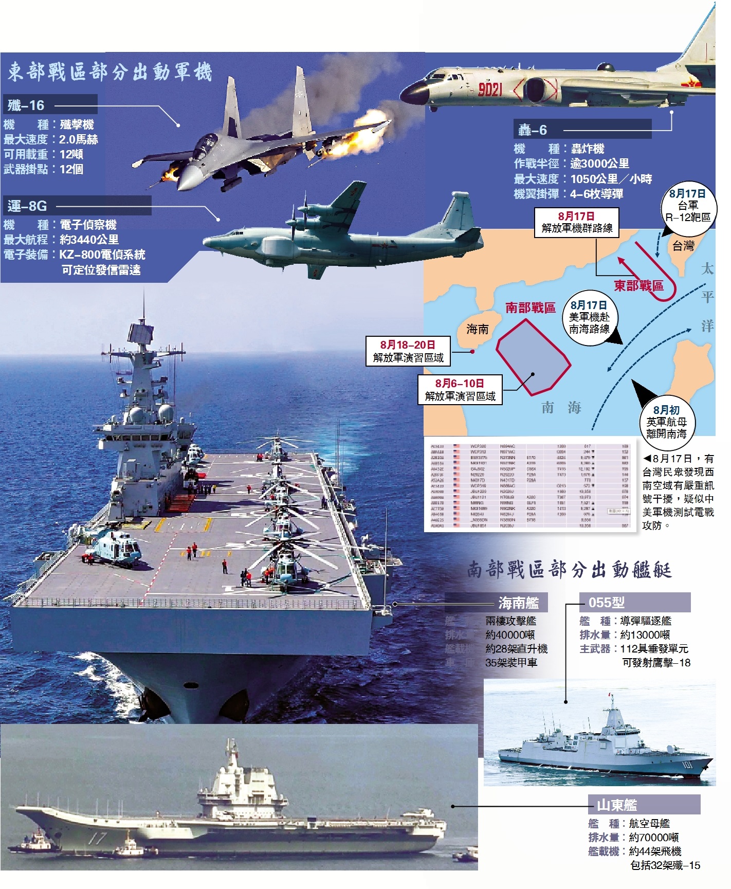 8月6日至10日,南部戰區在海南島東南方向至西沙群島附近海域,出動「山東」號航空母艦、「海南」號兩棲攻擊艦等艦隊主力進行軍事訓練。17日,東部戰區出動作戰艦艇、反潛機、殲擊機,在台灣島附近演練一體化聯合作戰。18日至20日,南部戰區再次在南海開展軍事訓練。