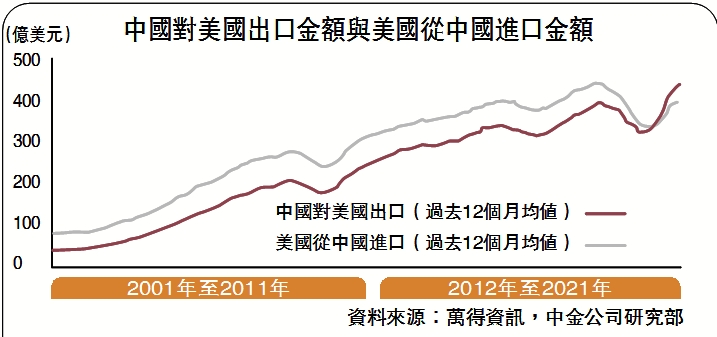 需要注意的是,中美統計口徑有差異。根據中國的統計數據,對美出口已經超過了疫情之前,可能有多個原因導致中美統計口徑出現差異:1)中美對進、出口價值的統計口徑不同;2)對轉口貿易的統計存在誤差;3)統計時點不同帶來差異;4)其他因素,包括匯率結算時點不同,細分行業口徑不一樣等。中美貿易摩擦後,尤其是疫情後,兩者差異縮小,甚至逆轉,導致中國對美國出口創新高,而美國從中國進口則仍然低於中美貿易摩擦前。疫情期間,海運費用上升、通過香港特區的再出口下降、運輸時間變長等因素可以部分解釋近期統計差異的變化,但另一個可能的原因是美國進口商為了規避關稅低報了自中國進口的價值。