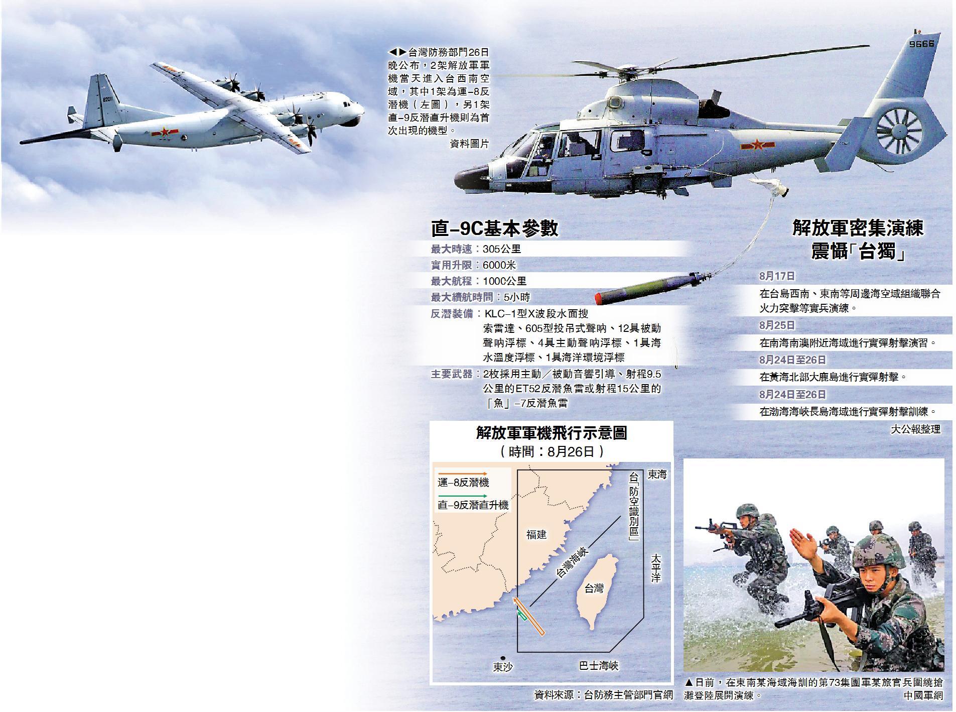 【大公報訊】據中通社報道:台灣防務部門26日晚公布,2架解放軍軍機當天進入台西南空域,其中1架是直-9反潛直升機。台媒稱,這是台防務部門自去年9月17日公布解放軍軍機動態迄今,首度記錄到直-9「擾台」。軍事專家分析認為,台軍目前擁有的潛艇並不構成太大威脅,解放軍加強巴士海峽周邊的反潛搜潛,目的是要了解美軍潛艇的動態,把美日潛艇部隊未來可能介入台海問題所帶來的風險降到最低。