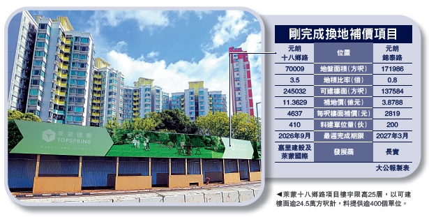 另邊廂,長實早前在業績會上透露,今年5月份跟政府就元朗錦田錦泰路一幅農地,達成換地協議。有關協議月前已完成,並要支付補地價近3.88億元。此地屬低密度住宅發展,樓宇高度限為7層,以可建樓面約13.76萬方呎計,每呎樓面地價只約2819元,應是新界西北區,即元朗及屯門在過去四年多來最低的每呎樓面補地價,與新地(00016)於2017年就屯門54區大型商住項目的補價相若,均只約2800多元。