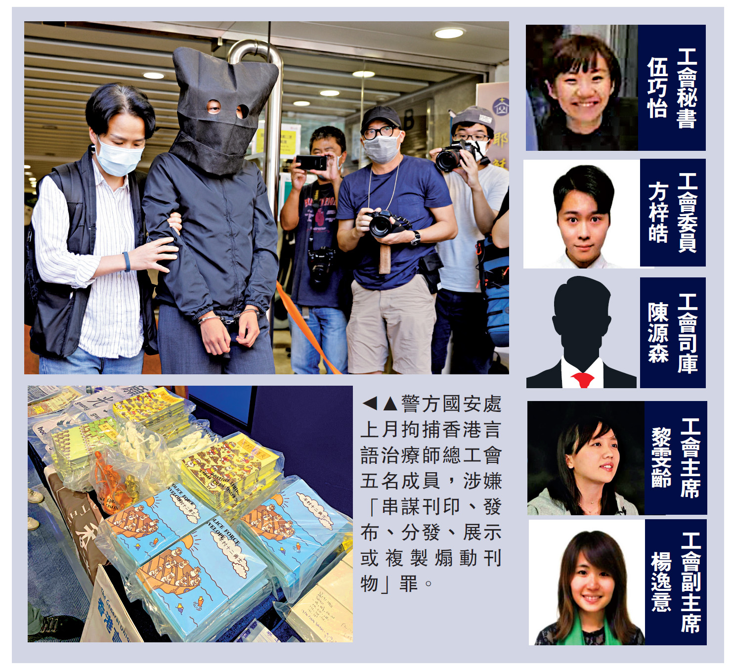 【大公報訊】記者黃浩輝報道:警方國安處上月22日拘捕「黃工會」香港言語治療師總工會五名成員,其中三人包括工會秘書伍巧怡、司庫陳源森及委員方梓皓,原定9月上旬向警方報到,昨日被警方撤銷保釋,即時起訴串謀發布煽動刊物罪名,連同上月已經被起訴還押的工會主席黎雯齡及副主席楊逸意,五人昨午於西九龍裁判法院提堂。主任裁判官羅德泉批准兩案合併處理,並把案件押後至9月24日再訊。五名被告的保釋申請都被拒絕,須還押監房候訊。