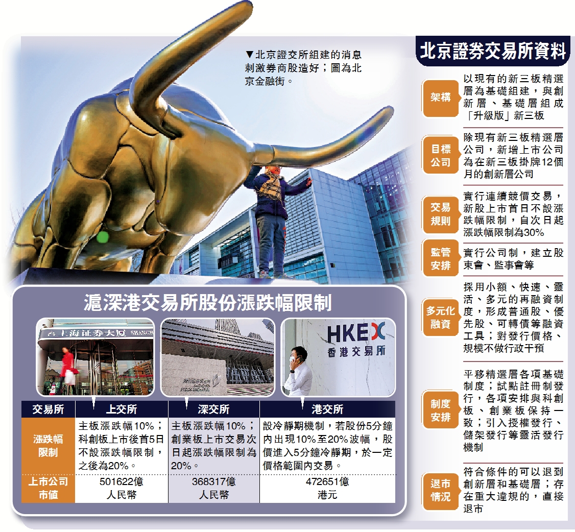 國家主席習近平周四宣布將成立北京證券交易所,中國證監會翌日隨即就有關基礎制度安排公開徵求意見。中證監公眾公司部主任周貴華表示,以新三板精選層為基礎組建的北京證交所,新增上市公司為在新三板創新層掛牌12個月的公司,試點註冊制發行,各項安排與科創板、創業板保持一致;新股上市公司首日不設漲跌幅限制,自次日起漲跌幅限制為30%。\大公報記者 柴進