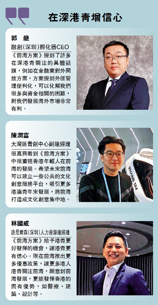 《前海方案》給予港青更好發揮的機會,讓港青更有信心。現在前海推出更多優惠政策,讓更多港人港青關注前海,願意到前海發展,更能發揮香港的固有優勢,如醫療、建築、設計等。
