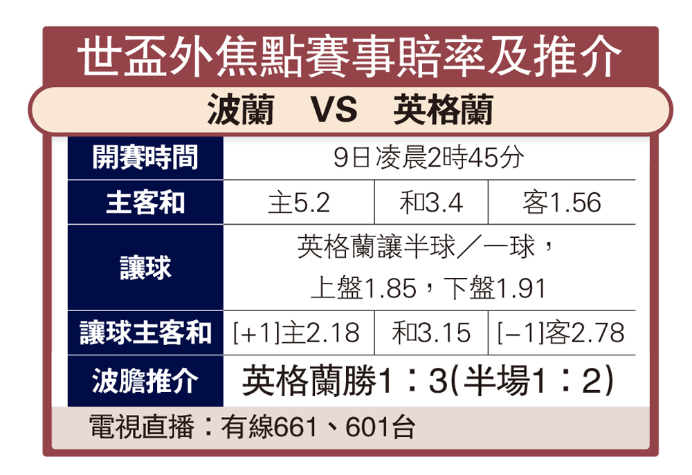 【大公報訊】據sportsmole報道:目前在世界盃外圍賽歐洲區I組5戰全勝的「三獅兵團」英格蘭,明晨將作客最大對手波蘭,再贏的話出線大概已安枕無憂,相信英軍也勢必速戰速決,「讓球」只讓半/一,必敲上盤。(有線661及601台明晨2時45分直播)