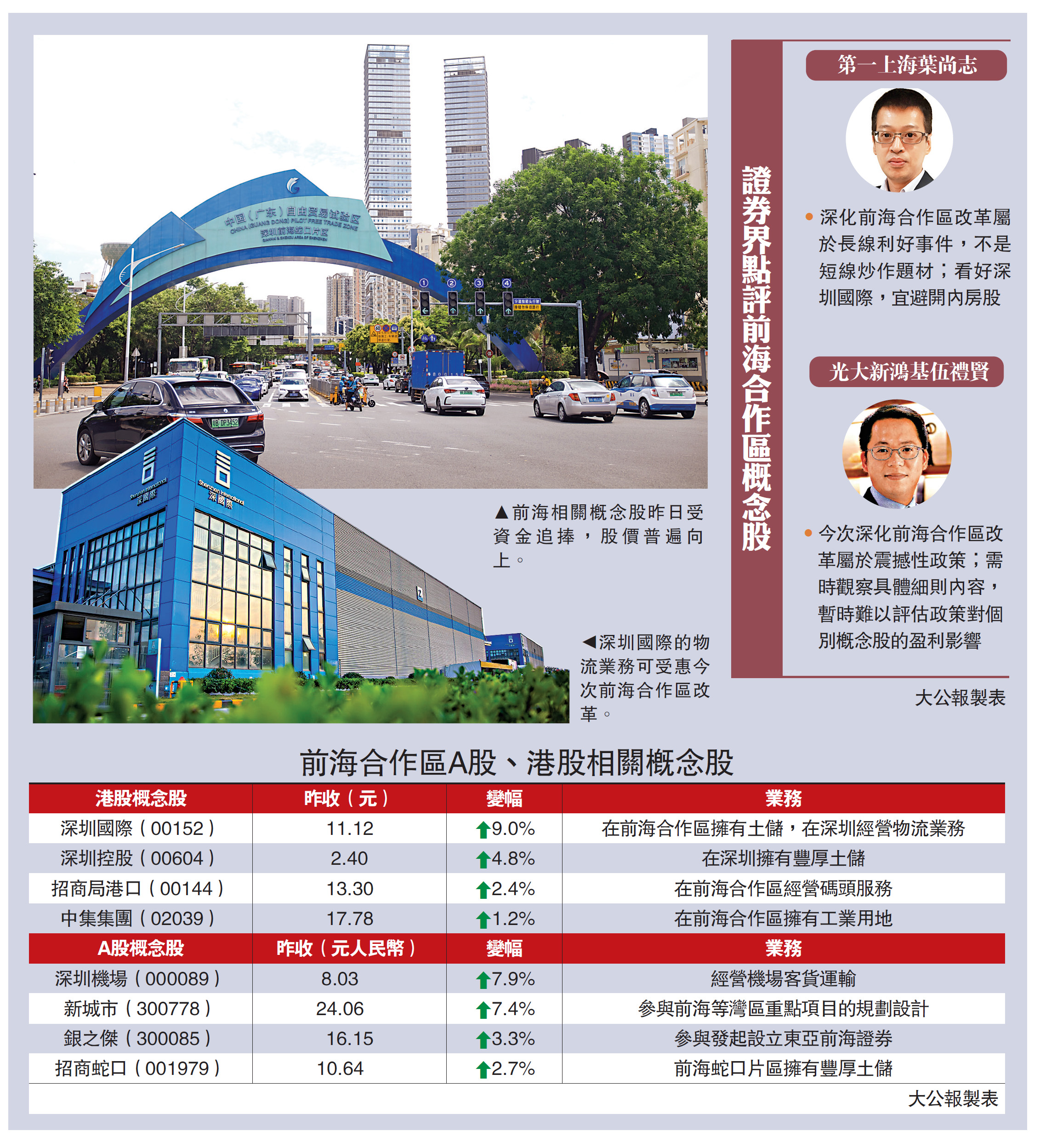 受到上述重大改革刺激,多隻概念股造好。深圳國際股價大漲9%,收報11.12元;儘管內房股昨日普遍繼續捱沽,但深圳控股在深化前海合作區改革催化下,股價升4.8%,報2.4元。在前海合作區擁有工業用地的中集集團(02039),股價升1.7%,報17.78元。除在港掛牌概念股受關注,內地A股的概念股亦跑贏大市。深圳機場(000089)股價升7.9%,報8.03元人民幣;參與前海等灣區重點項目的規劃設計的新城市(300778)股價升7.4%,報24.06元人民幣。