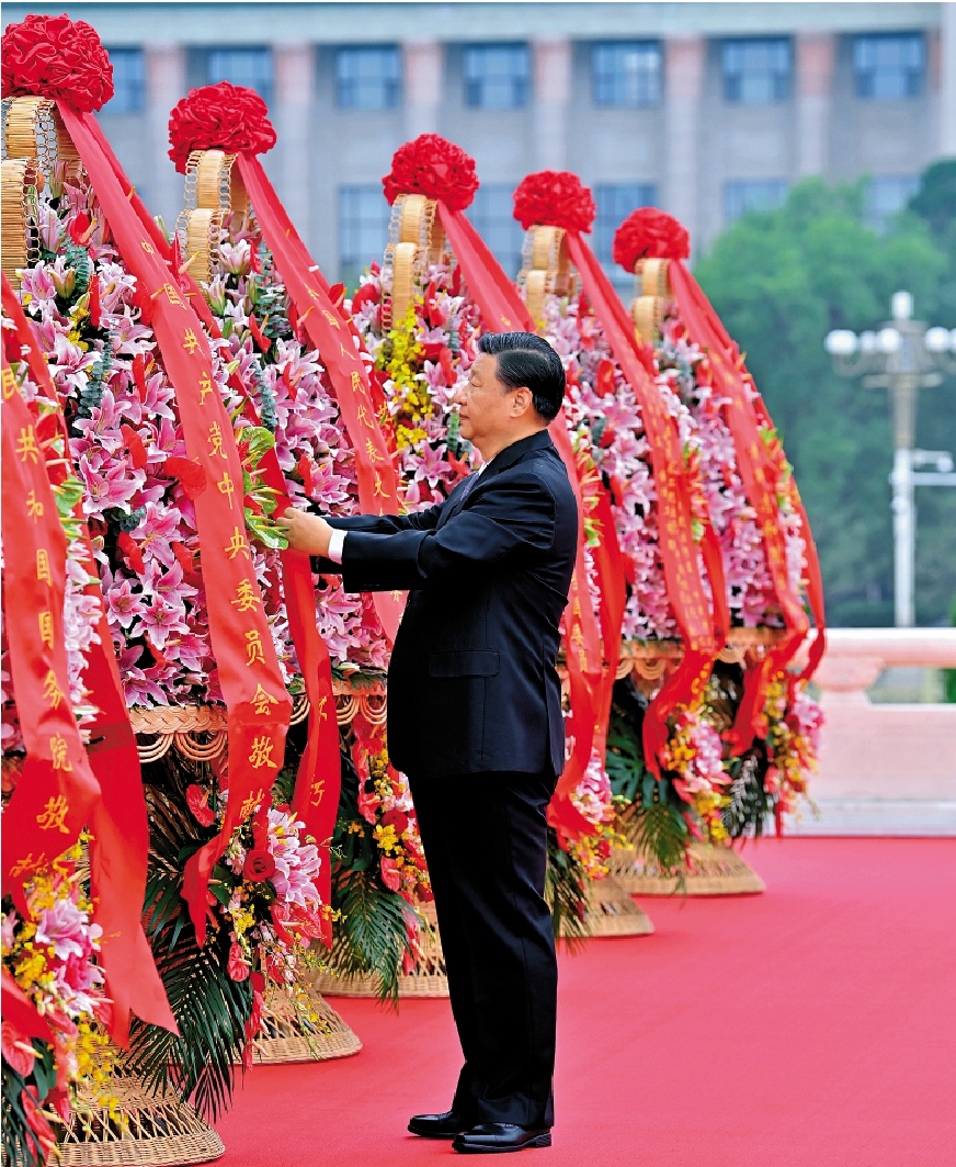 習近平邁步向前,仔細整理花籃緞帶。接着,習近平等黨和國家領導人緩步繞行,瞻仰人民英雄紀念碑。