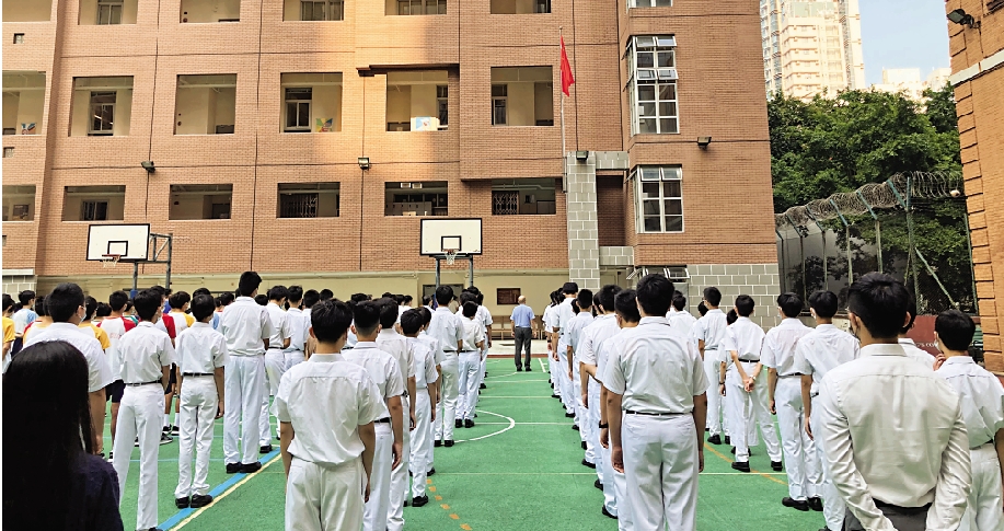 校方表示,由於防疫關係,該校安排中二級學生到操場觀禮,其餘級別的學生則於課室同步觀看直播。