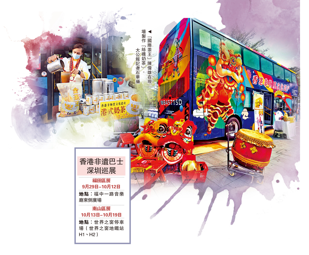 看「國際茶王」的拉茶表演,品一杯正宗的「絲襪奶茶」,聽一段關於大坑舞火龍的傳說,賞一曲帶有韻味的粵劇,最後再親自製作一下醒獅燈籠……「香港非物質文化遺產巴士巡展」透過主題巴士展示和線路巡遊,向參觀者介紹、推廣香港獨特的非物質文化遺產,自9月29日在深圳啟動以來,每天約3000餘名市民登車參觀,國慶期間大受歡迎反響熱烈。\大公報記者 石華深圳報道